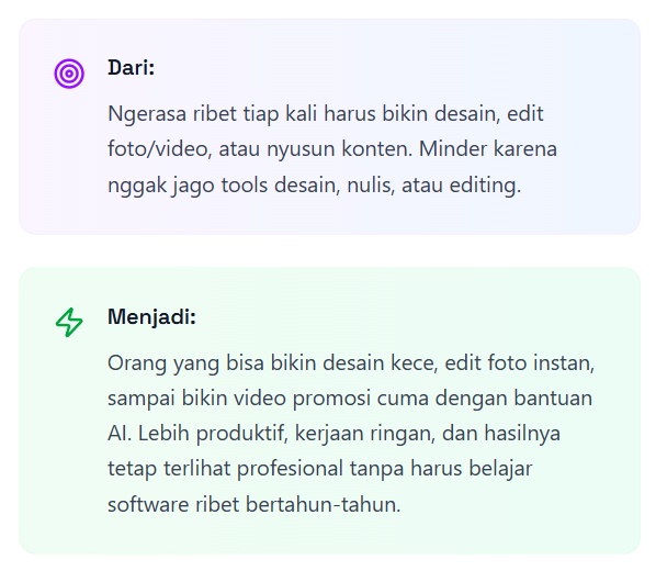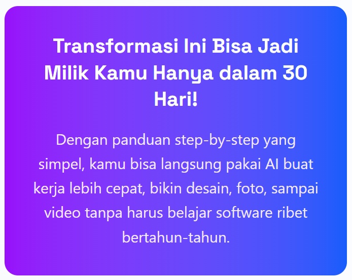 Beban kerja makin numpuk, stress makin tinggi, sementara orang lain udah nyantai karena dibantu AI. Dan yang paling nyesek, peluang bikin konten, bisnis, atau side hustle bisa lepas begitu aja, cuma gara-gara kamu nggak ngerti cara manfaatin teknologi yang sebenarnya udah gampang diakses semua orang.