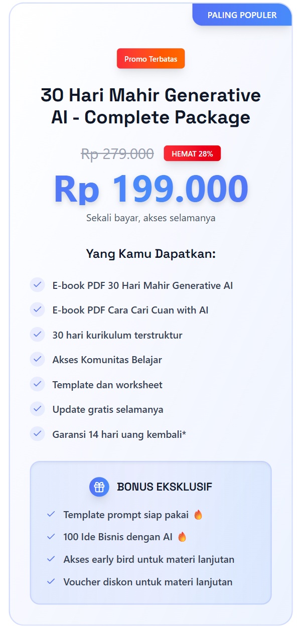 Jadi setelah kamu selesai membaca dan mempelajari ebook 30 Hari Mahir Generative AI, kamu bisa langsung mengeksekusi apa yang telah kamu pelajari sebelumnya melalui ebook kedua Cara Cari Cuan with AI.