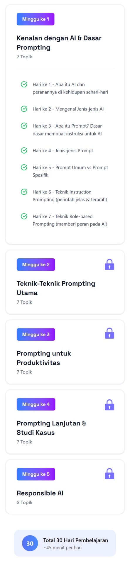 Kurikulum harian yang dirancang khusus untuk membangun pemahaman AI secara bertahap dan sistematis.